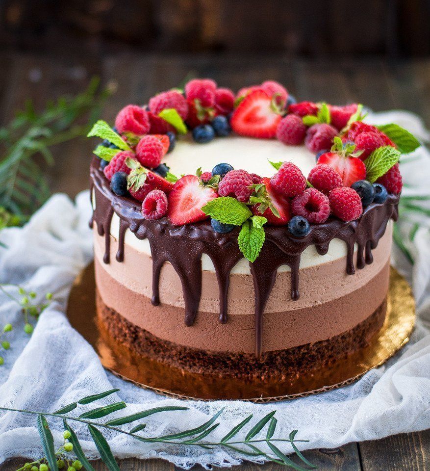 Тортик три шоколада, один из вариантов где видна начинка. Украшенный малинкой и мятой.
